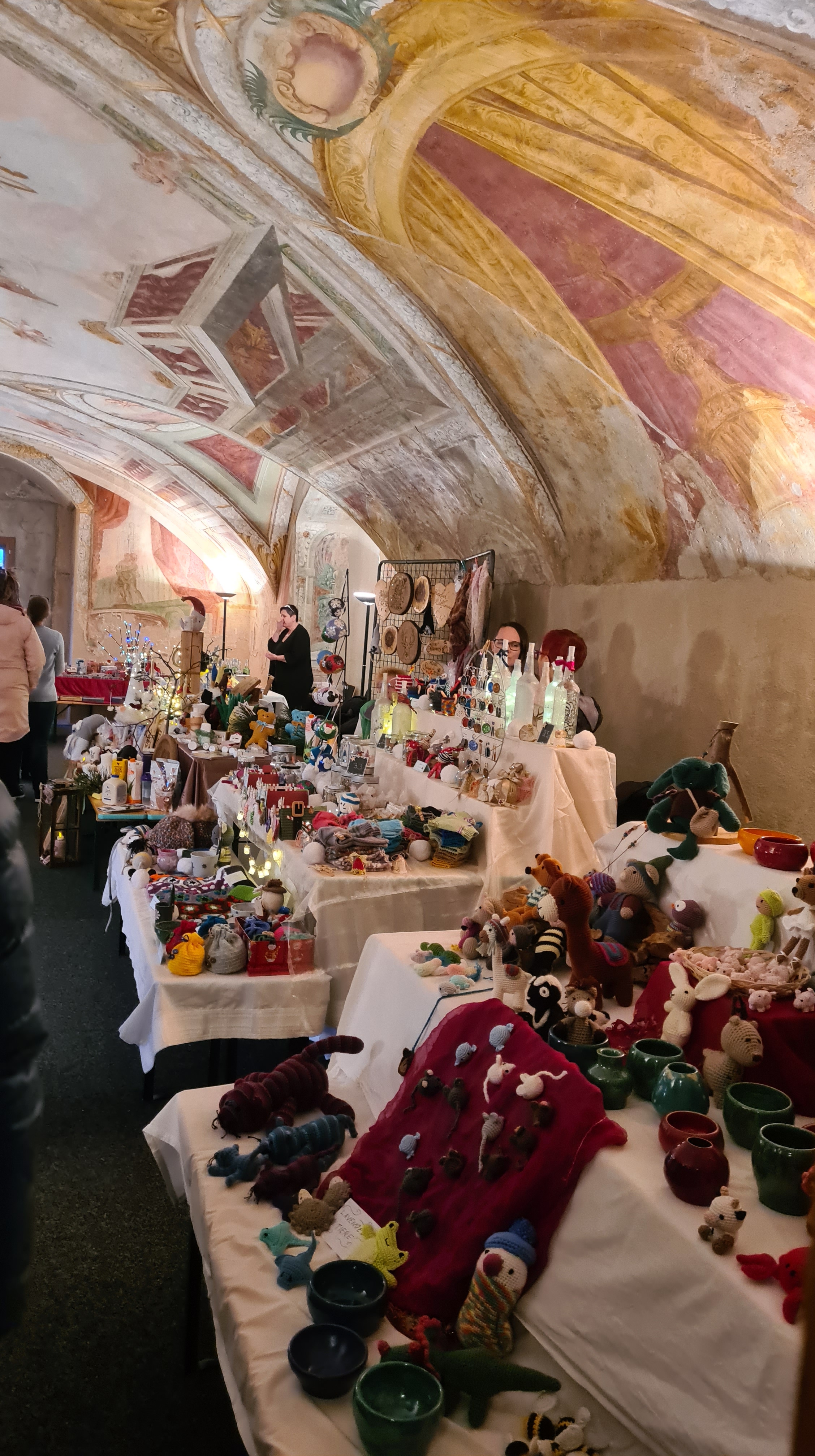 Im Schloss in der Schlossaula und dem Freskensaal findet ihr den Handwerksmarkt. Im Gemeinderatssitzungssaal gibt es von 15 Uhr bis 18 Uhr eine Wichtelwerkstatt für die Kinder betreut vom Vösolino Team.