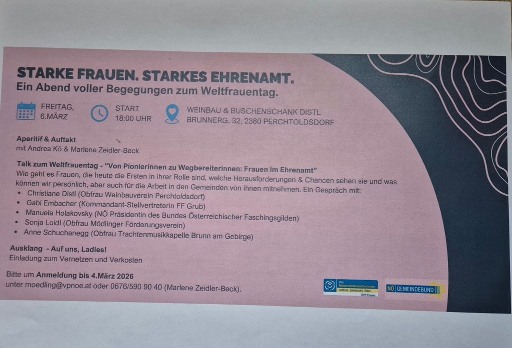 Am Sonntag den 8. März ist der internationale Weltfrauentag. Aus diesem Anlass laden die Wir Niederösterreicherinnen und der NÖ Gemeindebund im Bezirk Mödling am