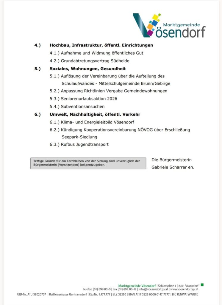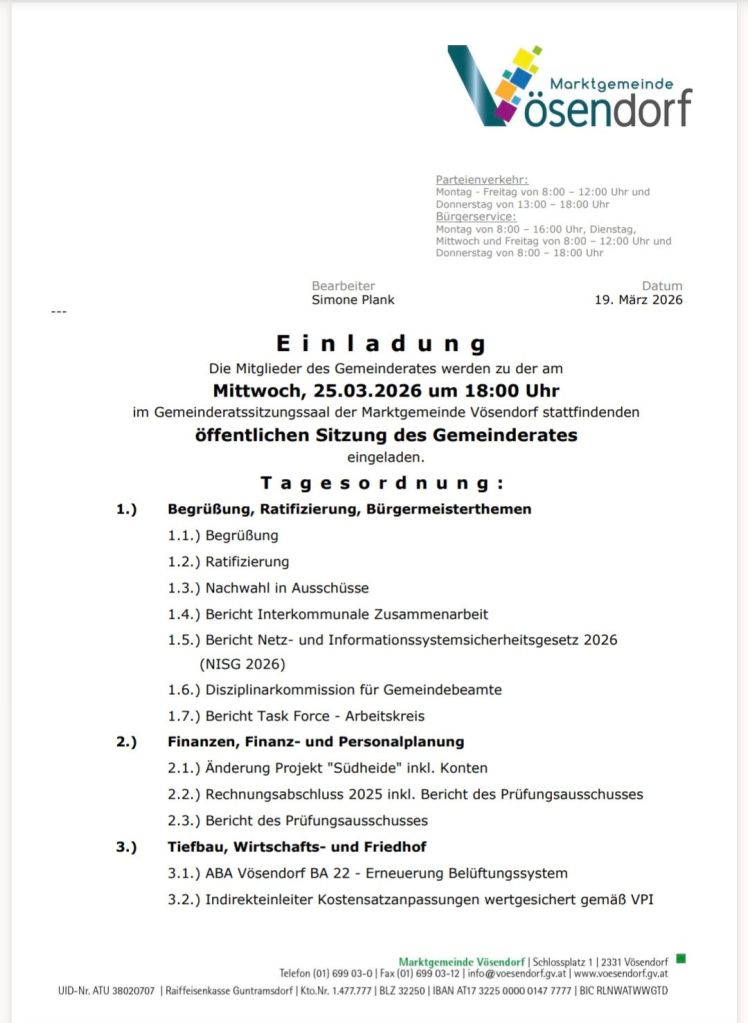 Am Mittwoch den 25. März 2026 findet wieder eine Gemeinderatssitzung in Vösendorf statt.
