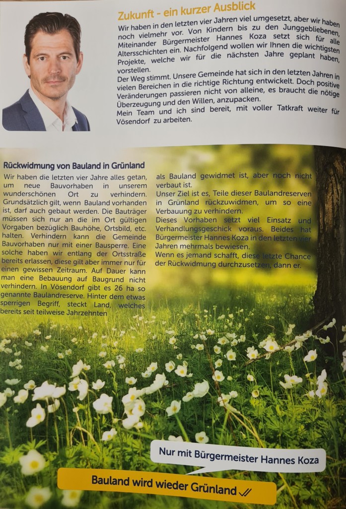 Daher wollen wir vorhandene Baulandreserven rückwidmen zu Grünland. Doch das ist nicht einfach und Bedarf viel Verhandlungsgeschick und Engagement. Beides hat Hannes mehrfach bewiesen in den letzten Jahren. Wenn es jemand schafft das Vorhaben auch umzusetzen, dann ist es er!