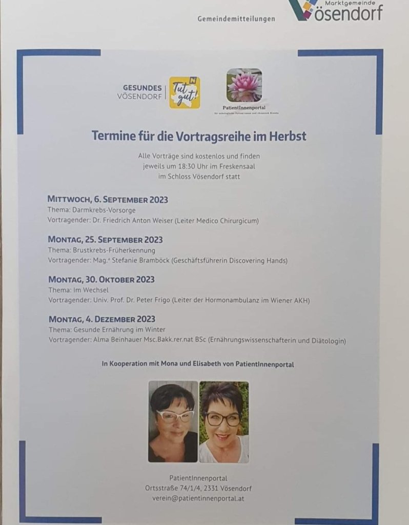 Die beliebte Tut gut-Vortragsreihe wird auch im heurigen Jahr fortgesetzt. Die gesunde Gemeinde Vösendorf und der Verein Patientinnenportal haben wieder spannende Vorträge organisiert heuer.