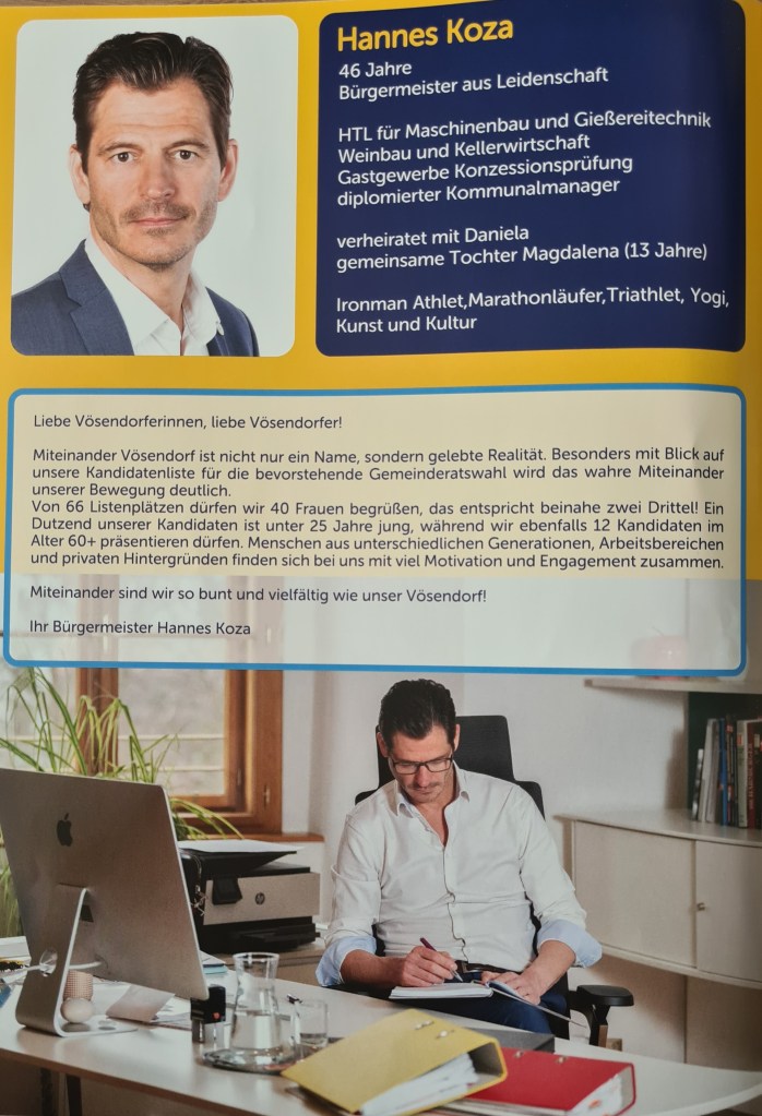 Dies gilt natürlich auch für mich. Meine Zukunft liegt in ihren Händen. Soll ich weiterhin meine Zeit, mein Wissen und meine Energie für Vösendorf aufwenden? Dann machen sie ihr Kreuz bitte bei Liste 1, Listenplatz 2.