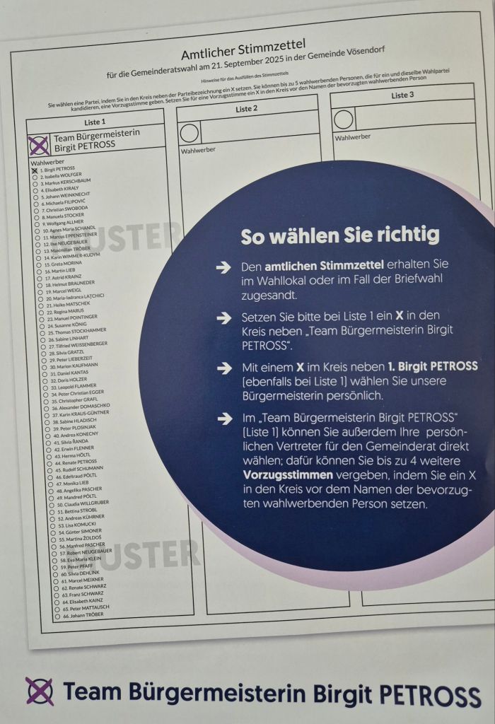 Beim Team Bürgermeisterin Birgit Petross sind die vergebenen Vorzugsstimmen, der einzige Faktor, wer von uns in den Gemeinderat einziehen wird. Die Listenplatzierung hat bei uns keinerlei Auswirkung auf das Endergebnis!