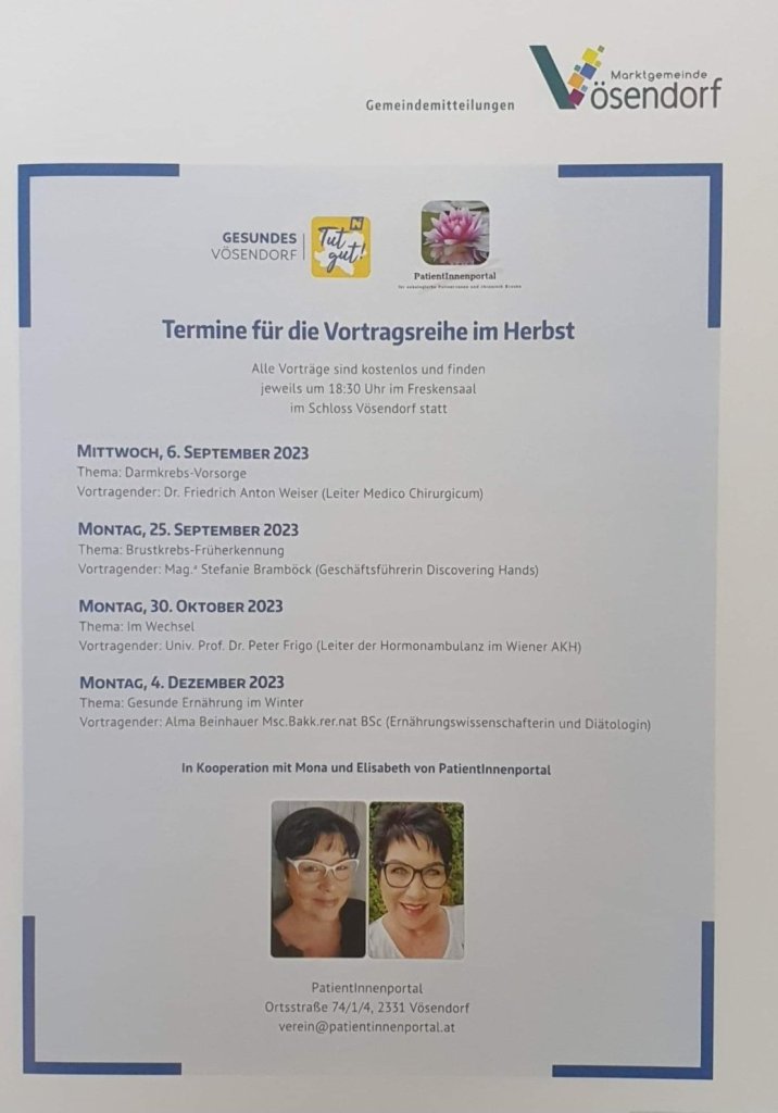 Am 6. September startet eine Vortragsreihe zum Thema Gesundheit. Es handelt sich dabei um eine Kooperation von Gesundes Vösendorf (Tut gut) und dem Verein Patientinnenportal. Ein Verein der mir bis jetzt noch nicht bekannt war. Also habe ich ihn gegoogelt. Und ich finde toll was dieser Vösendorfer Verein auf seiner Homepage alles anbietet! Hier geht es direkt zu der Vereinsseite.