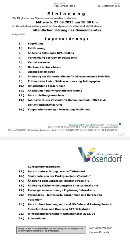 Unter anderem den Punkt Funktionsverordnung, wo es etwas gab, was ich so noch nicht kannte. Bei einem Tagesordnungspunkt hat sich zwischen der Gemeindevorstandssitzung und der Gemeinderatssitzung heimlich, still und leise ein zusätzlicher Punkt dazu geschlichen. Was unserer Meinung nach nicht sein darf. Es gibt klare Gesetze an die sich die Bürgermeisterin zu halten hat. Und dazu gehört auch, dass Tagesordnungspunkte vorbesprochen werden müssen. Jetzt kann man argumentieren, naja, der Punkt (Überschrift) wurde ja vorbesprochen, es ist halt nur eine Kleinigkeit dazu gekommen. Es war aber halt keine Kleinigkeit und er hatte mit den beiden ersten Punkten auch eigentlich gar nichts zu tun. Aber das wird die Aufsichtsbehörde zu klären haben.