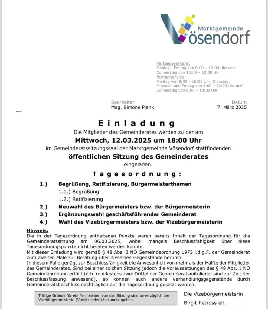 Morgen gibt es die Wiederholung der letzten Sitzung mit genau den selben Tagesordnungspunkten, wie in der letzten geplanten Sitzung. Gem. § 48 der NÖ Gemeindeordnung 1973 i.d.g.F reicht dabei die Anwesenheit der einfachen Mehrheit aus. Dabei dürfen wir aber nur die Punkte behandeln, die in der letzten Sitzung bereits auf der Tagesordnung gestanden sind.