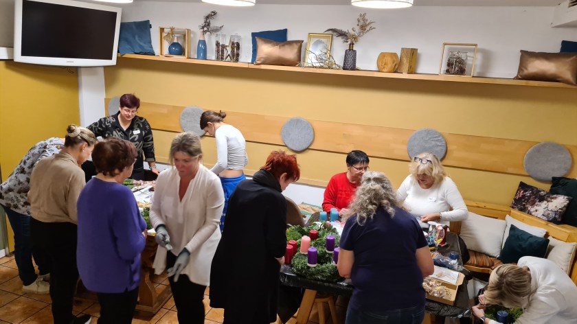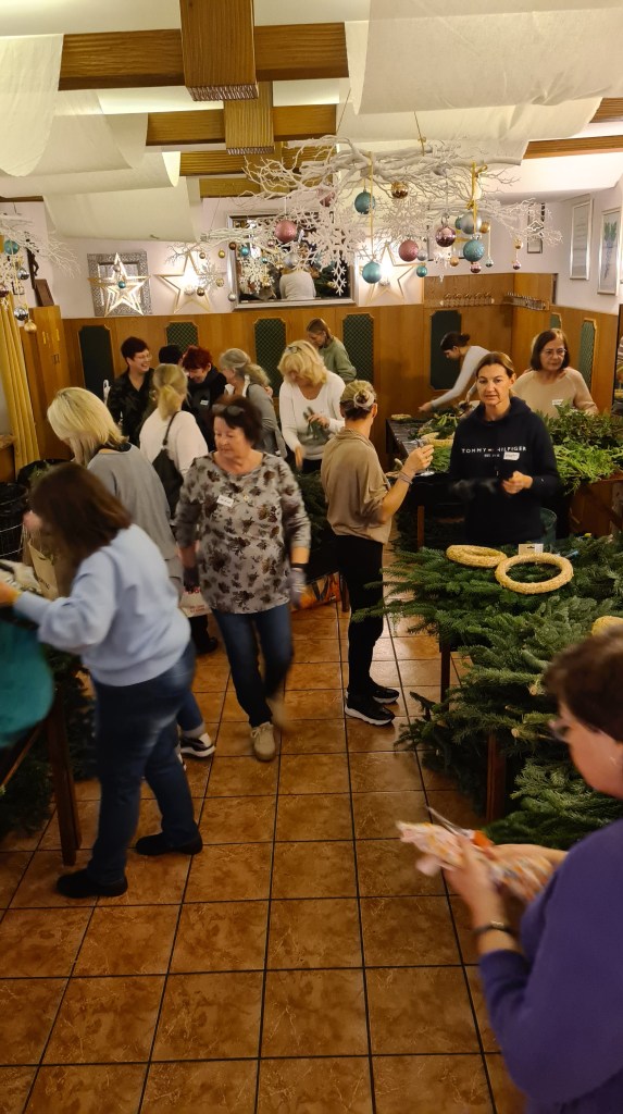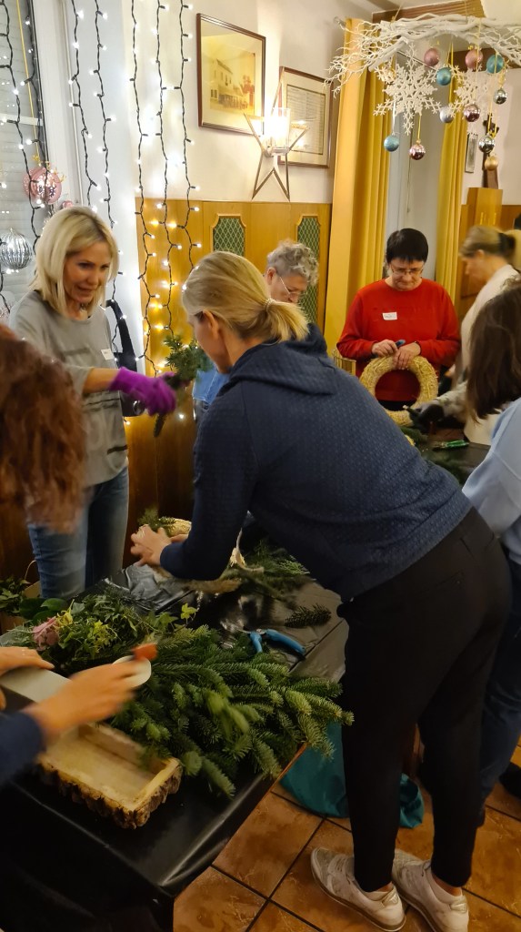 Wie auch in der Aussendung erwähnt, findet das traditionelle Adventkranzbinden statt. Persönlich freue ich mich schon sehr darauf. Dank der Unterstützung der anderen Damen, kann ich mich schon seit mehreren Jahren über einen selbstgemachten Adventkranz freuen, obwohl ich handwerklich gänzlich unbegabt und unkreativ bin.